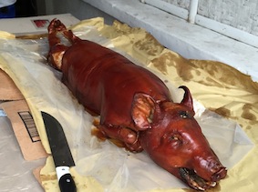 7日はみんなでパーティー!!!!! 何でもいいよ、食べたい物で〜 をスタッフに言った瞬間、全員が言ったのはレチョン(豚の丸焼き)