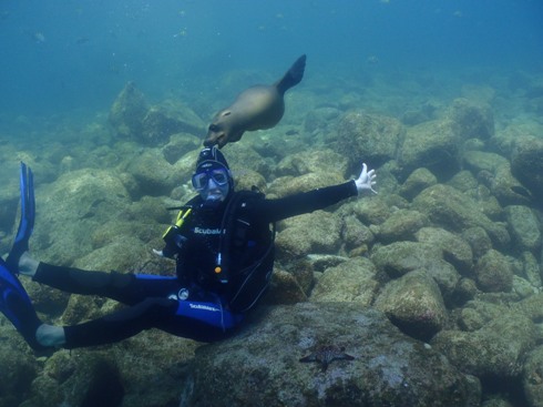 すっかりアシカちゃんになめられてしまっている 体験ダイバーさん。人間もアシカも楽しそう。
