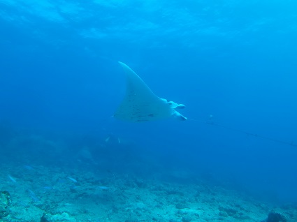 おまけにマダラトビエイの編隊までも見ることができました。そのあとはお約束のブラックマンタの登場。1ダイブ目はブラック3枚に白1枚が登場。2本目はブラック2枚に白1枚でした。1枚もしかすると初見かもしれないブラックマンタでした。