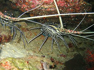 今回はシミランクルーズにおけるナイトダイブの主役を紹介します。 まずはエビ代表のロブスター。シミランクルーズのナイトダイブではゴシキエビやシマイセエビが見ることができます。ロブスターは触覚が岩の隙間からでていることが多く、意外と簡単に見つけることができるかもしれません。 前クルーズではお客様と一緒にテーブルサンゴの下や岩の隙間を根こそぎチェックしながら進んでおりました。お互いに発見するとトーチで合図を送り、品定め開始。。。やはり大きければ大きほど嬉しいですね!