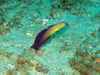 3本目はスリーツリーズ。 今回は砂地半分、コーラルリーフ半分。 砂地では【ミズタマハゼ】がせっと口から砂を吐き出しておりました。